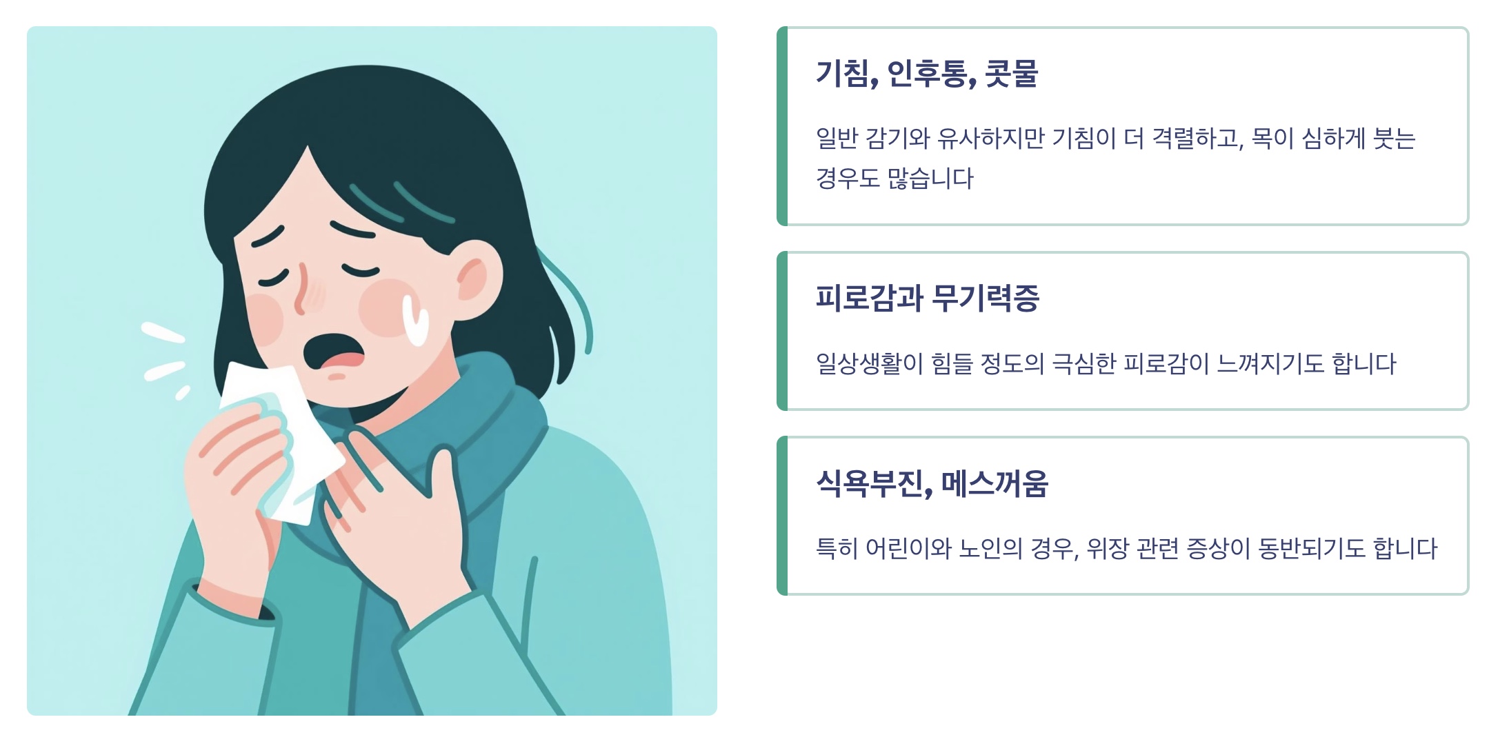 일반 감기와 유사하지만 기침이 더 격렬하고, 목이 심하게 붓는 경우도 많습니다.