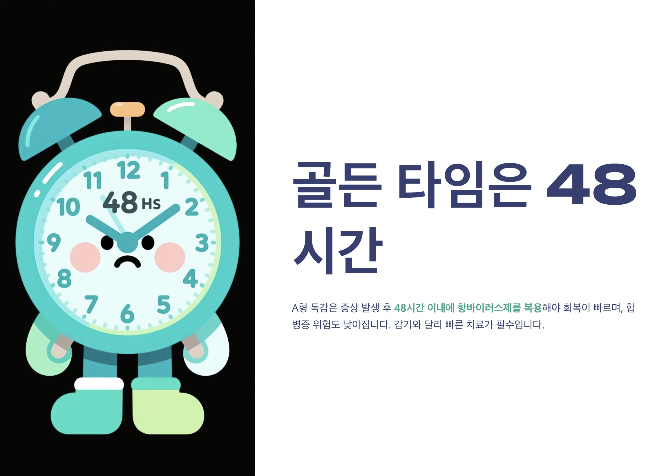 - 증상 발현 48시간 이내 병원 내원 시, 항바이러스제인 타미플루 처방 가능